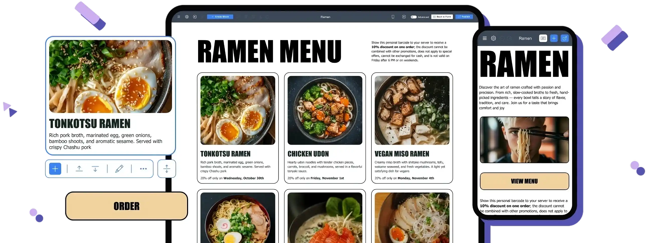 เมนู การจอง จัดส่ง รีวิว และโปรโมชั่นพิเศษ — ทั้งหมดในหน้าเดียวที่สวยงามบนมือถือ แบ่งปันผ่าน Instagram, Google หรือรหัส QR ที่ร้านของคุณ.